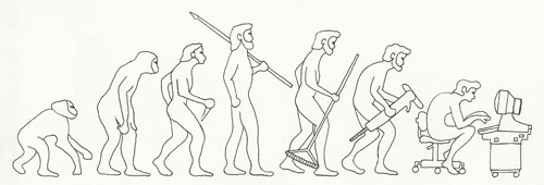 Mennesket er den mest intelligente skabning på jorden – det mener vi i hvert fald selv – og alligevel opfører vi os på mange måder ualmindeligt uintelligent. Den intelligente teknologiske udvikling har gjort menneskekroppen tilsvarende mindre intelligent. Denne klassiske illustration viser meget fint, hvordan vi burde have holdt fast i bue og pil. Faktisk har vores gener ikke kunne følge med, hvilket er en af forklaringerne på, hvorfor vi ikke tåler den livsstil, vi har i dag.